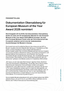 Die Dokumentation Obersalzberg wurde als eines von 35 europäischen Museen für den European Museum of the Year Award 2026 (EMYA) nominiert. Sie wird vom European Museum Forum unter der Schirmherrschaft des Europarats verliehen und ist eine der bedeutendsten Auszeichnungen für Museen in Europa.